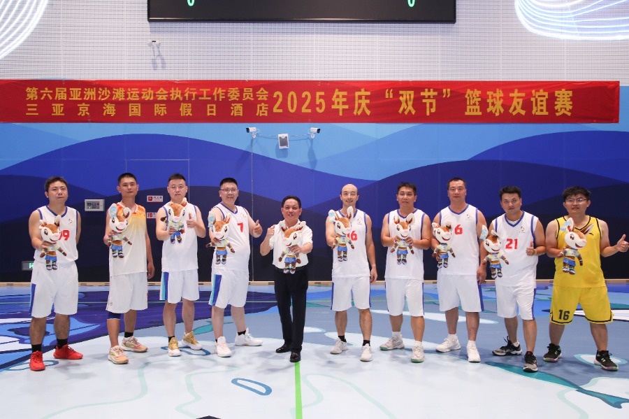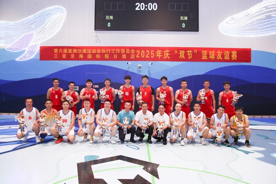 为庆祝国庆、中秋“双节”,迎接2026年第六届亚洲沙滩运动会(以下简称:三亚亚沙会)开幕式倒计时200天,9月30日晚,中共第六届亚洲沙滩运动会执行工作委员会临时委员会(以下简称:亚沙会临时党委)与京海国际假日酒店联合举办了一场篮球友谊赛,旨在以篮球为纽带,在竞技比拼中深化交流,在协作拼搏中凝聚奋进力量。