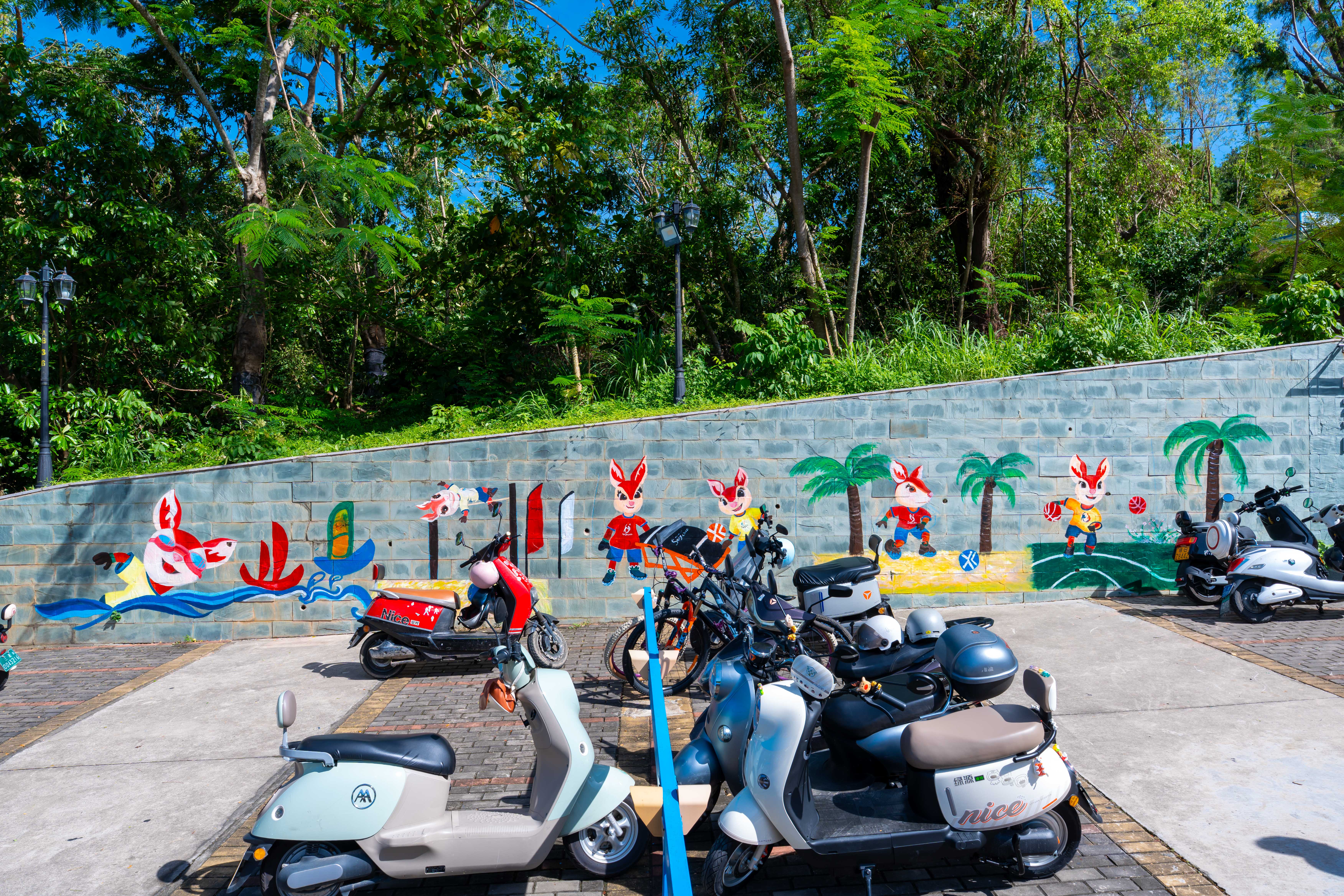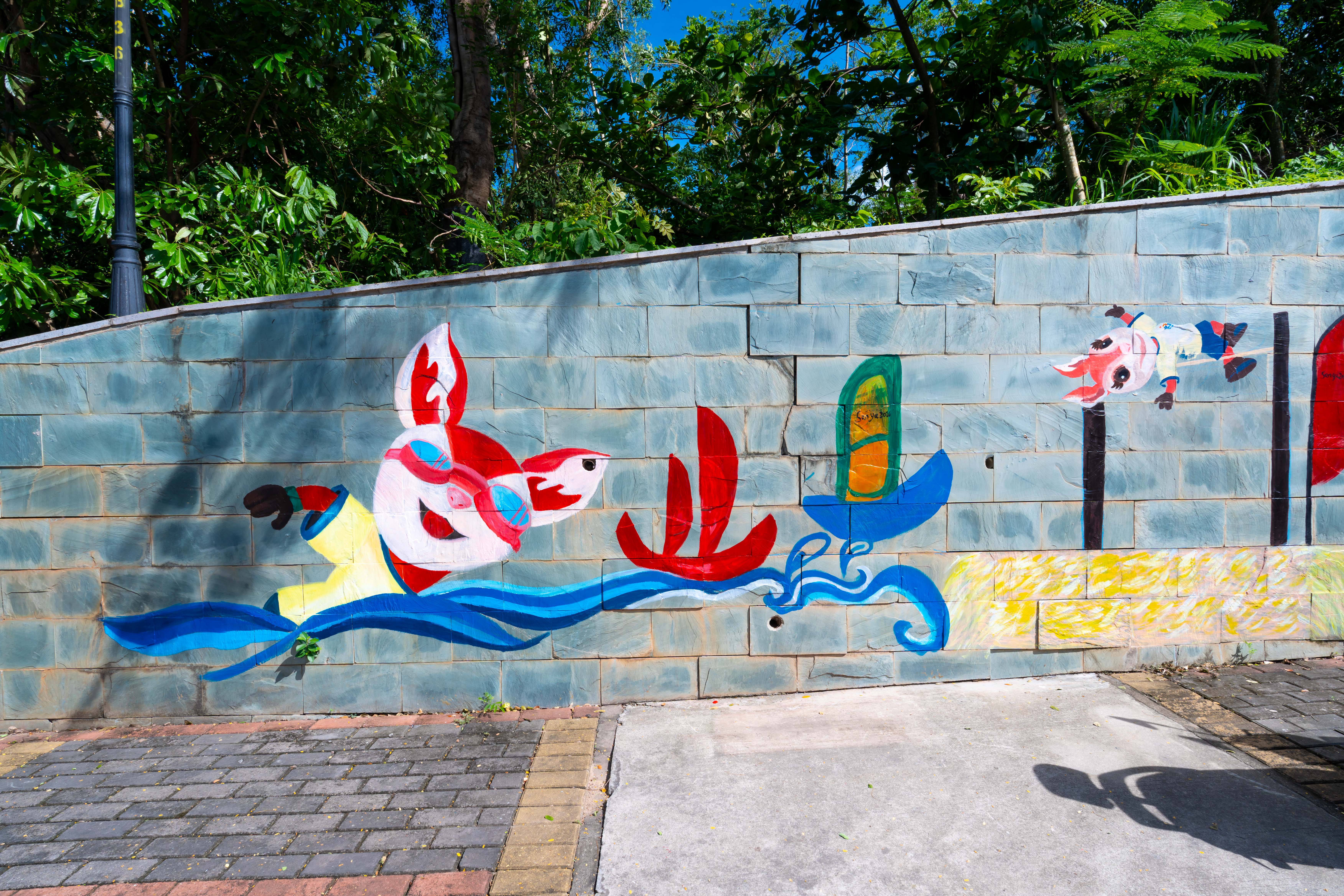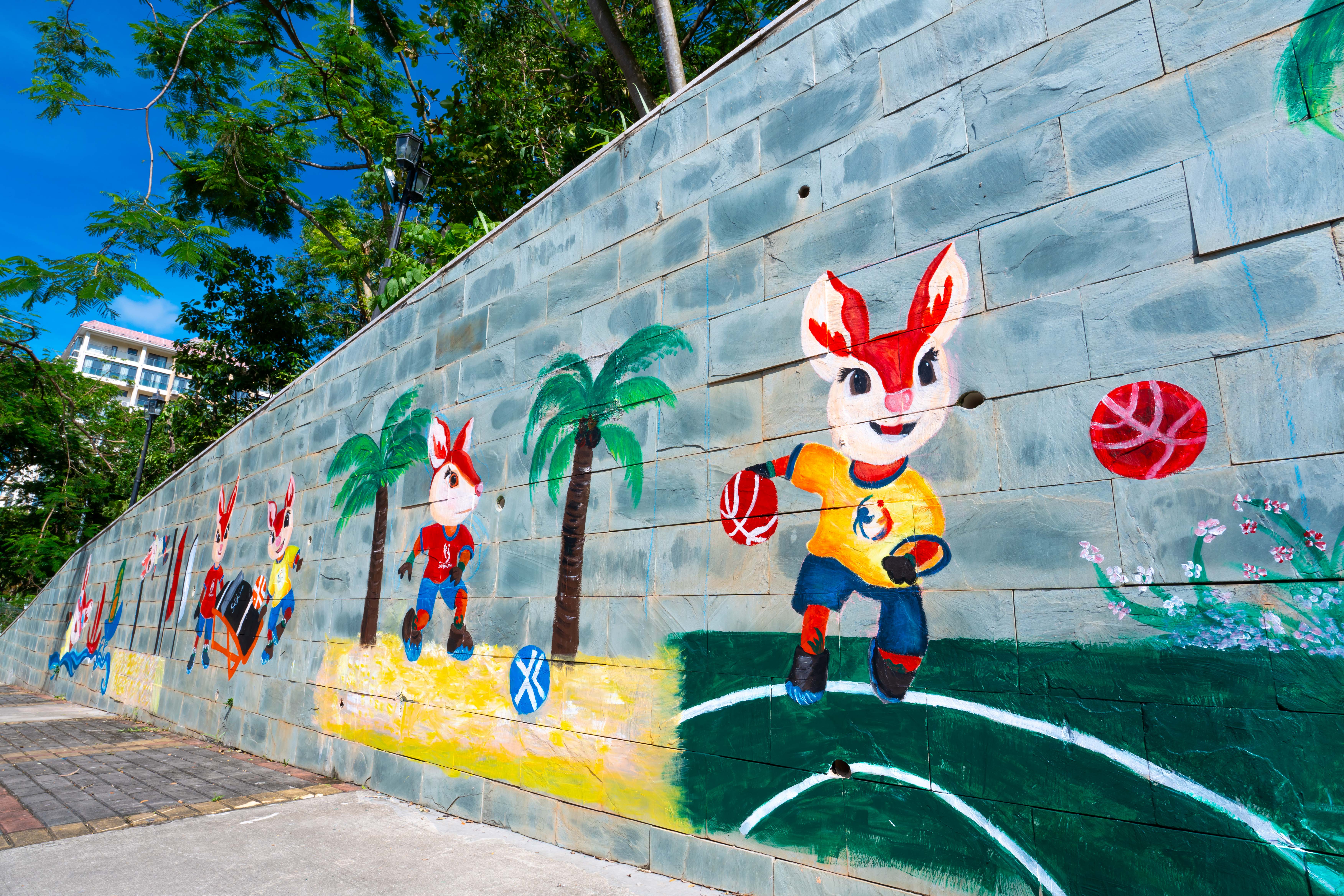 这面主题墙绘位于三亚临春岭森林公园停车场通往环山步道的C位,鲜艳的色彩配上动感十足的画面。在8米长的墙面上,吉祥物“亚亚”活力全开,三人篮球、沙滩足球、游泳样样在行,整个画面仿佛能听到海浪声与欢呼声,海滨城市的热情扑面而来。